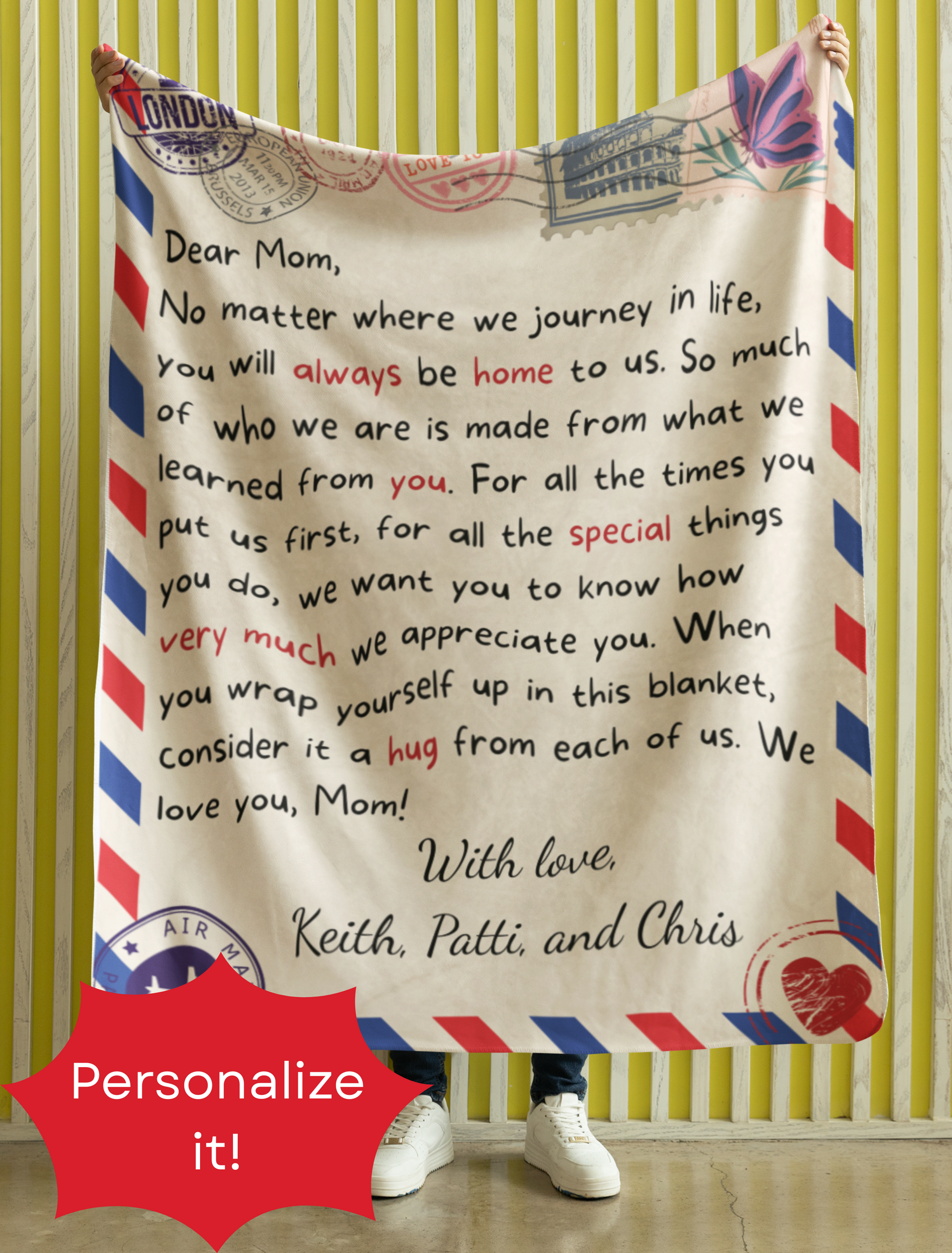 This is a gift Mom will never forget and will cherish for years to come. Up to three lines of personalization will make this blanket especially dear to Mom. It's a perfect gift for any occasion. Add our own personalization in the box above.